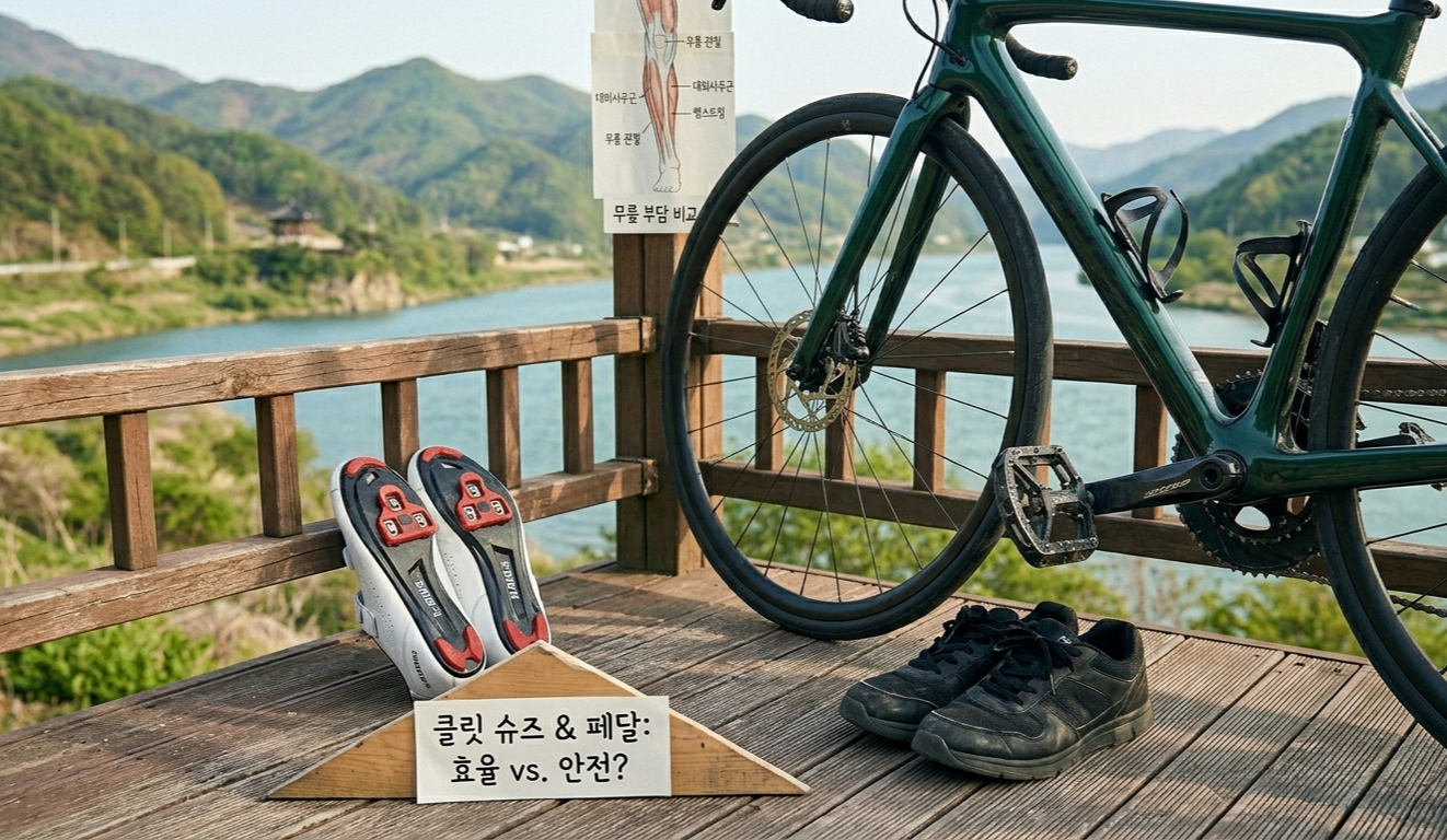 플랫 페달이 무릎에 더 낫다는 시각도 있습니다. 항상 같은 위치에 발이 고정되면 과사용 부상(overuse injury)이 누적될 수 있다는 논리인데, 과사용 부상이란 특정 동작이 반복되면서 관절이나 근육에 미세한 손상이 쌓이는 것을 말합니다. 플랫 페달은 발 위치를 자유롭게 바꿀 수 있어 매번 조금씩 다른 각도로 힘이 분산되는 구조입니다. 과학적으로 완전히 입증된 주장은 아니지만, 저도 초반 한 달 경험을 돌이켜 보면 완전히 무시할 수는 없는 이야기입니다.